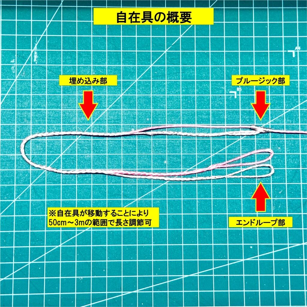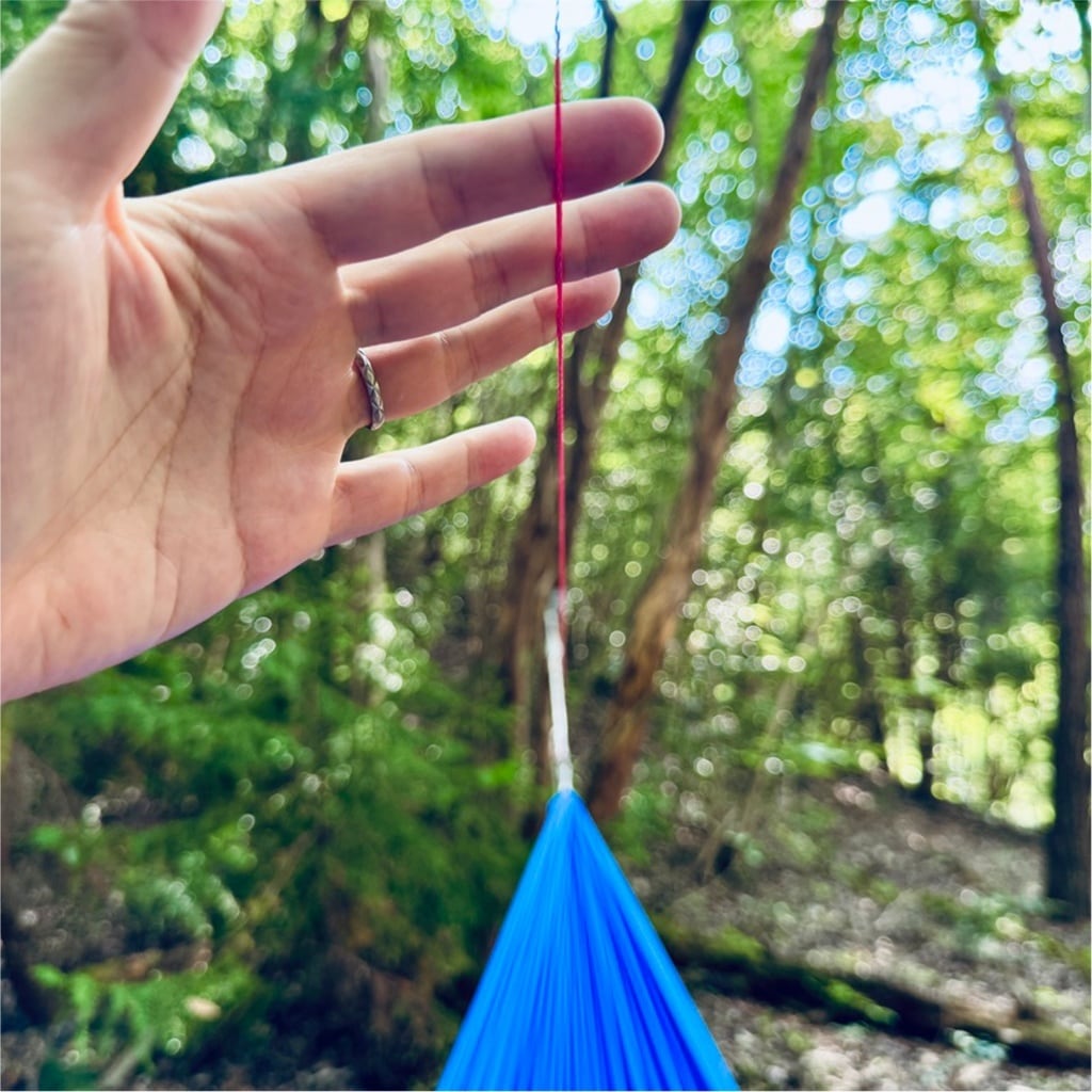 自在具付きのリッジラインです。リッジラインというのは、ハンモックの両端(ギャザーエンド)に設置して、ハンモック本体の吊り下げ角度を調整するためのものです(図3及び図4参照)。自在具をスライドさせることで 500mm - 3000mm の範囲で長さを調節することができます。そのため、テントやタープのガイラインとしての利用も可能です(図6及び図7参照)。3.5gと軽量なので、僕はエマージェンシーキットにも入れています。このリッジラインは最高ランクのUHMW-PE(超高分子量ポリエチレン)を使用しており、スリング単体の破断強度は290kgです。Made in Mt.ROKKOH。